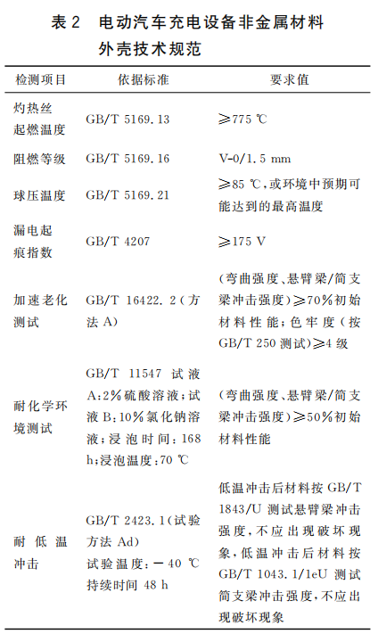 中国质量认证中心(CQC)于2016年4月24日发布了国内首个《电动汽车充电设备非金属材料外壳技术规范》(见表2),该技术规范从充电桩的实际使用环境出发,通过对材料耐老化、耐候、耐低温冲击、阻燃、耐热、电气绝缘等方面性能的考核,来评价材料是否能够达到长期使用要求。